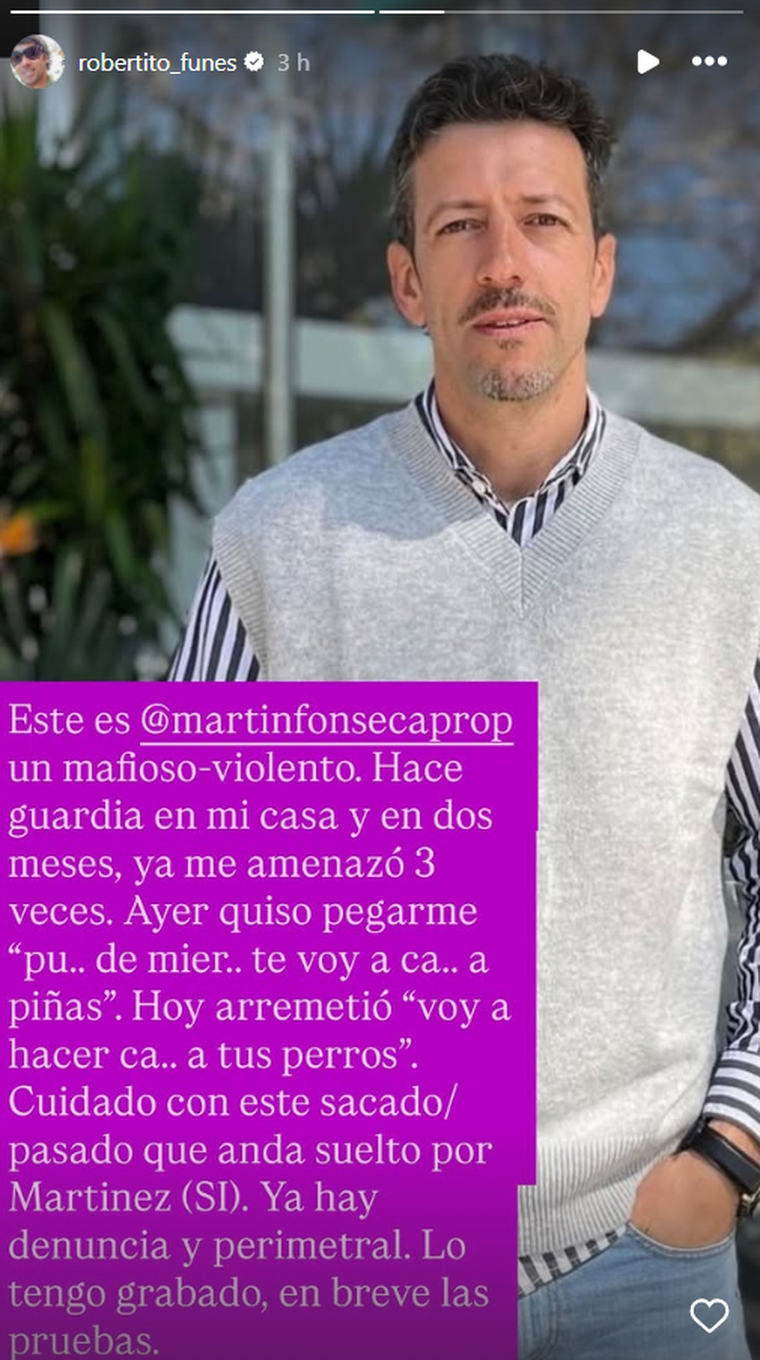 "Este es Martín Fonseca, un mafioso y violento", comenzó escribiendo en su cuenta de Instagram. Luego, agregó que la tensa situación ocurrió nada más ni nada menos que en la puerta de su vivienda, lo que genera en él más temor.