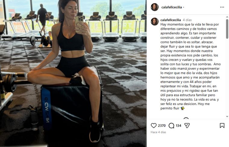 "Trabajar en mí, en mis prejuicios y mi rigidez que fue tan útil para esa estructura familiar, pero hoy ya no la necesito. La vida es una, y ser feliz es una decisión. Hoy me permito fluir", concluyó Cecilia Calafell.