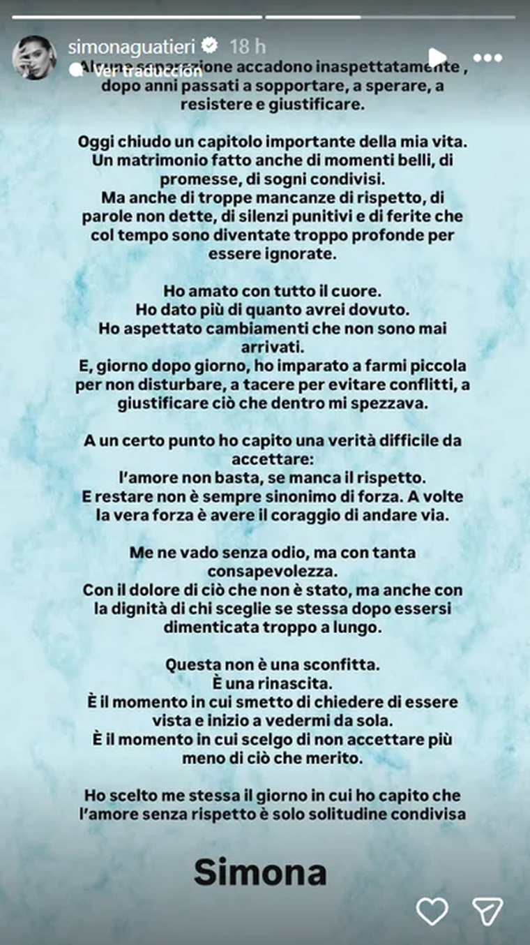 A través de un extenso descargo en sus redes sociales, la italiana reflexionó sobre el proceso de resiliencia que atravesó antes de tomar esta determinación. En sus palabras, el distanciamiento no fue un impulso repentino, sino el resultado de un largo periodo de tolerancia: "Algunas separaciones ocurren inesperadamente, después de años de soportar, esperar, resistir y justificar". Guatieri describió su presente como el cierre de un ciclo que, aunque tuvo proyectos y sueños en común, se volvió insostenible por la ausencia de valores fundamentales.