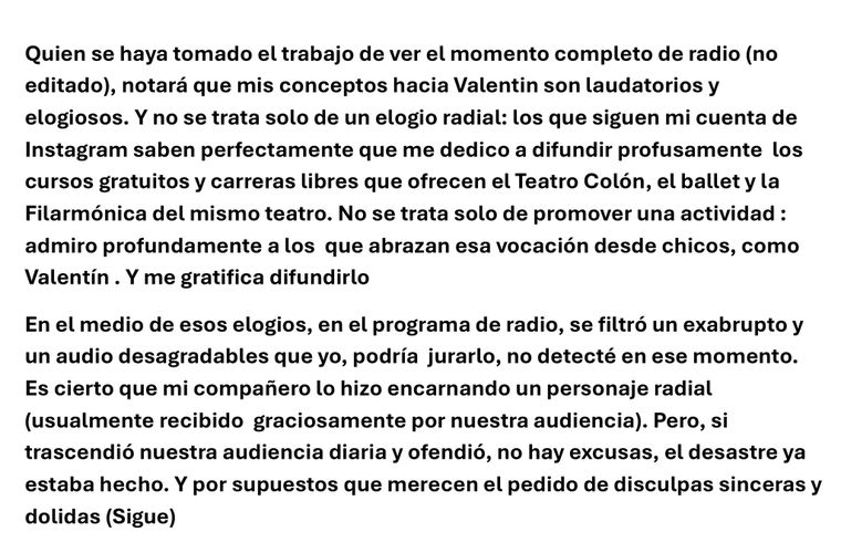 El conductor compartió un comunicado y dejó en claro que "en el medio de los elogios, en el programa de radio, se filtró un exabrupto y un audio desagradable que yo, podría jurarlo, no detecté". También sostuvo que su compañero lo hizo "encarnando un personaje radial (usualmente recibido graciosamente por nuestra audiencia)".