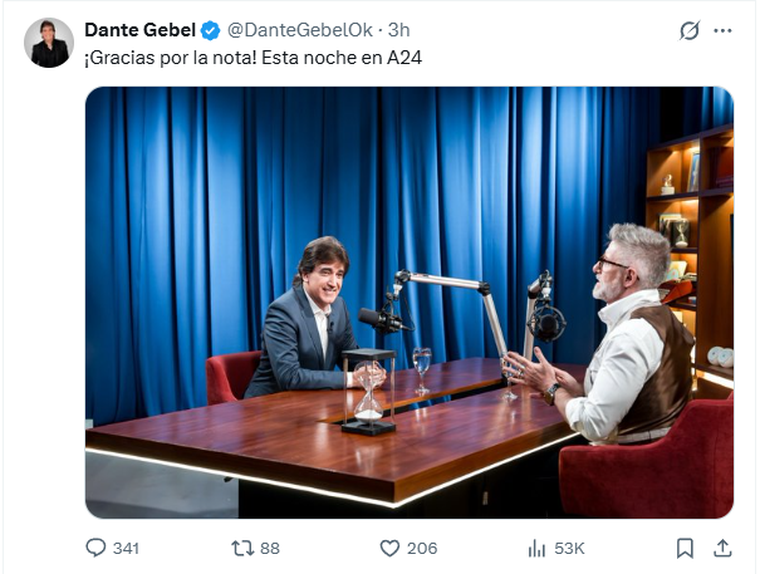 La entrevista se dará por la pantalla de A24 en la medianoche de este mismo miércoles. En sus redes sociales oficiales, Gebel confirmó la noticia con una fotografía junto al periodista: "¡Gracias por la nota! Esta noche en A24".