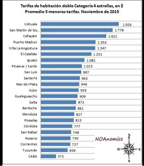 En el gráfico que elaboró la consultora se puede ver que las tarifas hoteleras del sur son casi cinco veces más caras que las de la Ciudad de Buenos Aires y más de tres veces más caras que provincias como Tucumán o Corrientes.