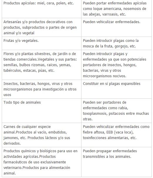 Los siguientes productos son de ingreso regulado, y deben ser declarados sin importar su cantidad, grado de industrialización o tiempo desde que se obtuvo. En el cuadro, al lado de su descripción, se explica el motivo por el cual están sujetos a control y posible prohibición de paso.