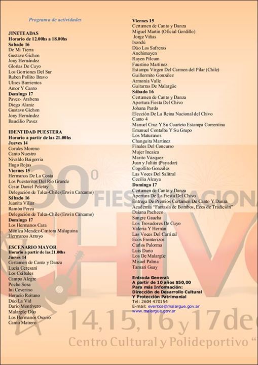 El jueves 14 comenzó la XXX Fiesta Nacional del Chivo. La celebración popular malargüina se extenderá hasta el domingo 17 de enero. El lugar elegido este año para la fiesta es el Centro Polideportivo y Cultural Malal Hue, espacio cubierto capaz de albergar a más de 5 mil personas. La entrada general, por cada una de las cuatro noches es de 50 pesos para el Escenario Mayor y el de la Identidad Puestera y para las jineteadas que se desarrollan entre las 12 y 18 horas.