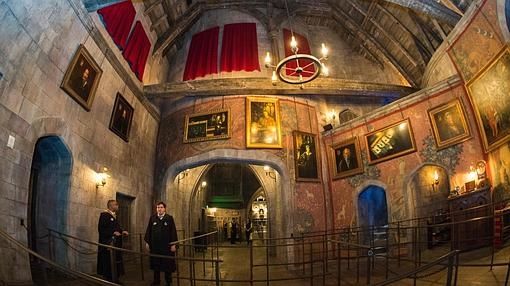 La atención al detalle del «Wizarding world» es impresionante, desde la pátina de piedras grises del pub «Cabeza de Puerco» (Hog's Head) hasta los muebles. En las calles adoquinadas del pintoresco pueblo de Hogsmeade resuenan las conversaciones de los comerciantes y los clientes del pub, con los tejados cubierto de nieve.