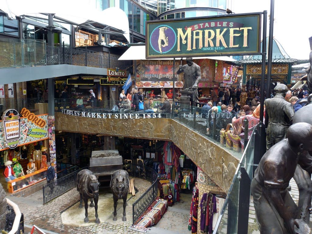 Un gran atractivo sin duda es el mercado, uno de los más grandes de Londres. Su nombre se debe a que el mercado se instaló en lo que fueron las antiguas caballerizas o establos de una compañía ferroviaria. Asique es normal encontrarse entre puesto y puesto de comida, esculturas de caballos talladas en madera.