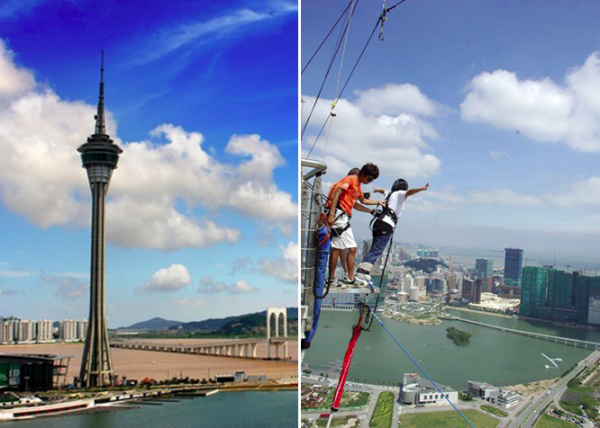De acuerdo con el Guiness de los récords, sus 233 metros lo convierten en el salto bungee comercial más alto del mundo. Desde allí arriba la panorámica de la ciudad de Macao es espectacular, aunque puede que no resulte tan atractivo saltar no sobre un río o un cañadón entre montañas, sino derechito de cabeza a... ¡un estacionamiento! Adrenalina máxima.