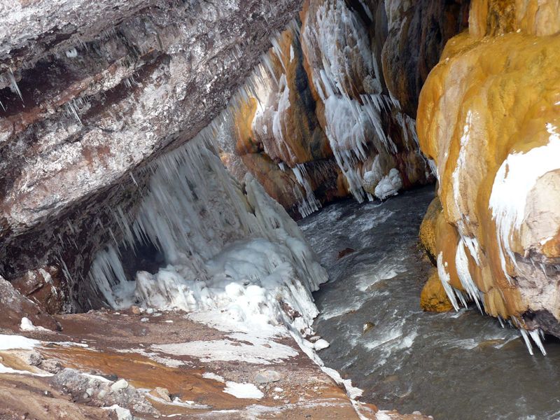 En la margen derecha alberga a las famosas termas, con cinco fuentes del mismo tipo, pero de diferentes temperaturas y componentes. Los singulares cerros que hay a su lado y el río Las Cuevas que pasa decenas de metros por debajo del puente completan la postal.