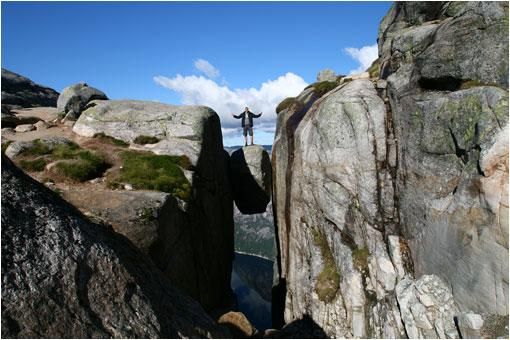 Kjeragbolten - el nombre oficial de la roca - se encuentra en el borde de la montaña Kjerag en Oslo, Noruega. A una altura de 1000 metros, está encajada entre dos paredes totalmente verticales sobre el fiordo de Lyse. Las fotos sobre esta piedra son muy conocidas; muchos se la toman incluso saltando, a otros en cambio les tiemblan las piernas con solo pararse sobre la misma. Pero lo que es seguro es que un paso en falso en ese lugar puede ser mortal.