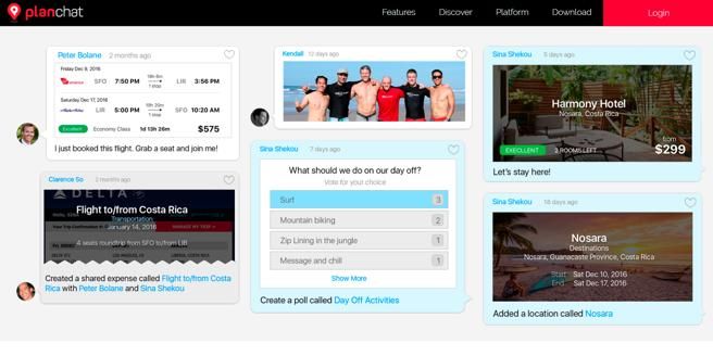 Es una aplicación de mensajería (todo en uno) que permite a los usuarios descubrir, planificar y coordinar viajes en grupo. La herramienta integra mensajes de texto y correos electrónicos, de este modo todo el mundo se mantiene informado, incluso si no se tiene la aplicación. Los usuarios pueden crear una idea de viaje, buscar hoteles y vuelos, explorar las experiencias recomendadas, documentar y asignar precios, y posteriormente, invitar a los amigos y chatear en grupo.