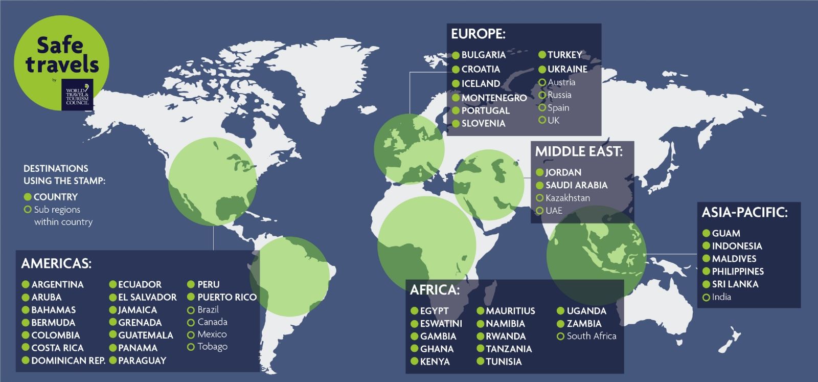 El WTTC, Consejo Mundial del Viaje y el Turismo, diseñó el sello "Safe Travel" o "viajes Seguros" con el objetivo de tener reglas comunes entre los diversos destinos del mundo. Para construir así, un futuro de viajes que sea seguro, fluido y proporcione una experiencia auténtica y significativa al viajero durante todo el viaje.