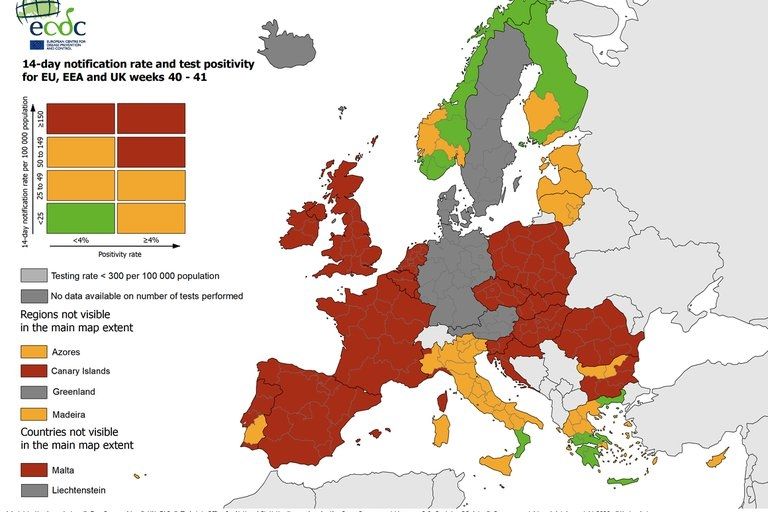 En este mapa solo tres países de la UE o el Espacio Económico Europeo (Noruega, Finlandia y Grecia) están en su mayoría en verde, mientras que cinco: Italia, Chipre, Estonia, Lituania y Letonia, se encuentran en naranja. Hay países que no están coloreados por la falta de información sobre los test, esto son Alemania, Austria, Suecia, Dinamarca e Islandia.