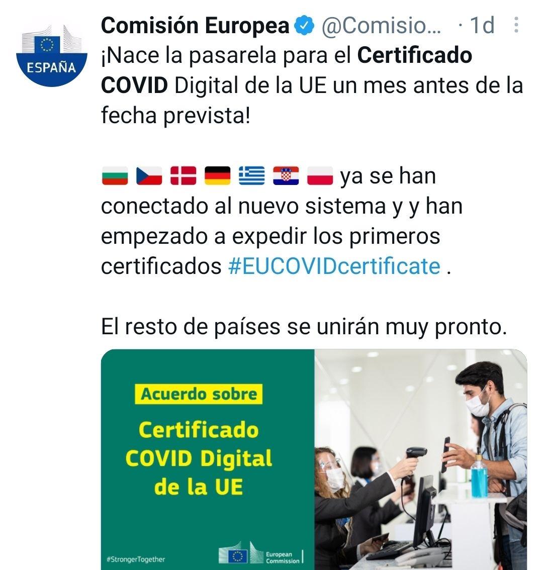 A raíz del acuerdo político alcanzado el 20 de mayo entre el Parlamento Europeo y el Consejo sobre el Reglamento por el que se rige el certificado, desde el 1 de junio ya ha entrado en funcionamiento la estructura técnica de los sistemas de la UE.