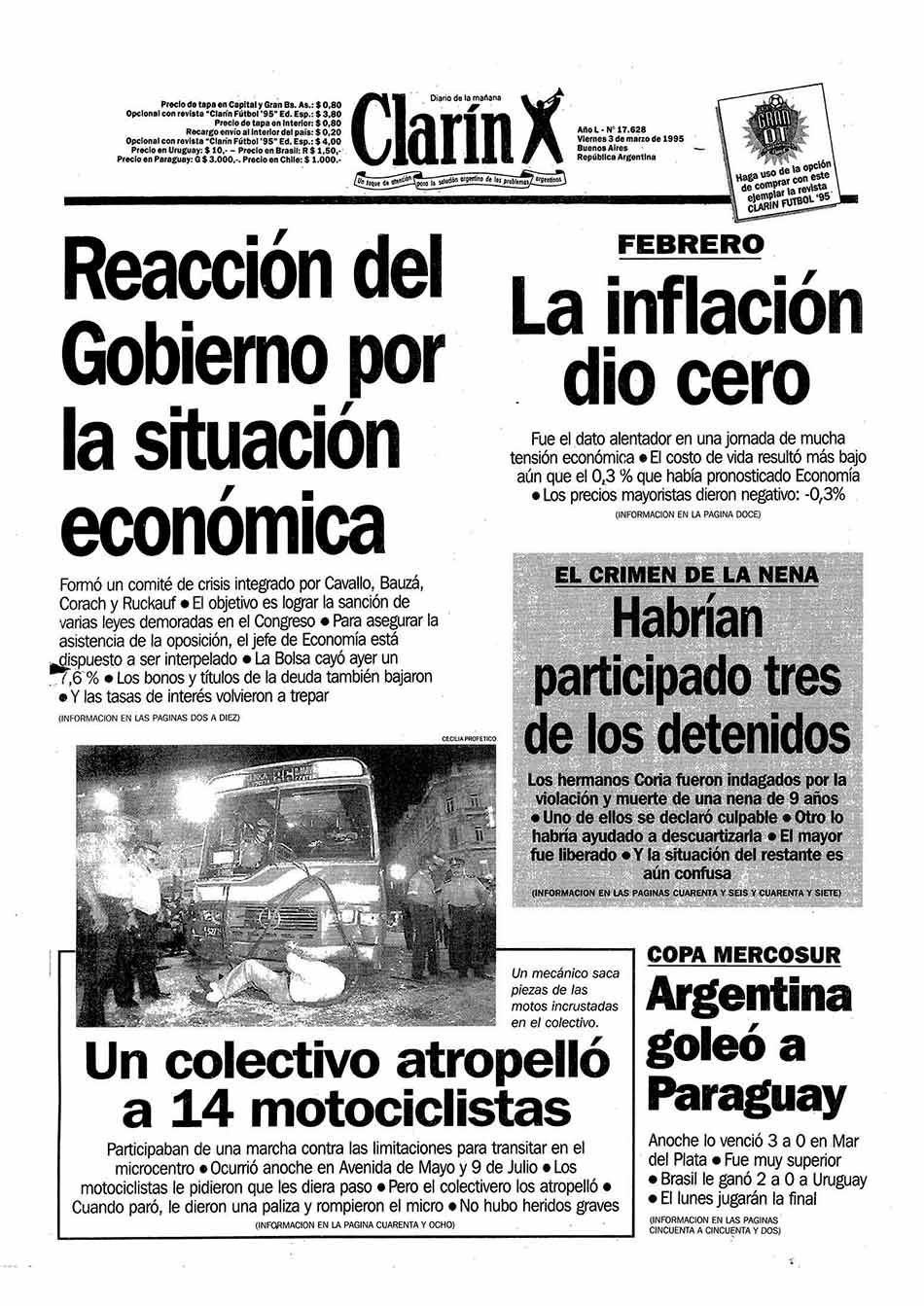 La portada del matutino porteño del 3 de marzo de 1995 tenía como nota principal la reacción del Gobierno de Carlos Menem por la delicada situación económica, pero también le daba un lugar preponderante a la baja de la inflación de febrero. "La inflación dio cero", indicaba, y destacaba que fue aún menor a la pronosticada por Economía, que era de 0,3%.