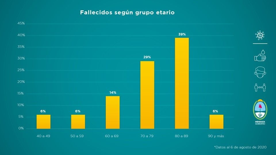 Al observar el porcentaje de fallecidos según el grupo etario, Mendoza cuenta con una Tasa de Mortalidad de 24.8 por millón de habitantes; de Incidencia (infectados cada 100.000 habitantes) de 93.7 y de Letalidad 2,44% cada 100.000 habitantes.