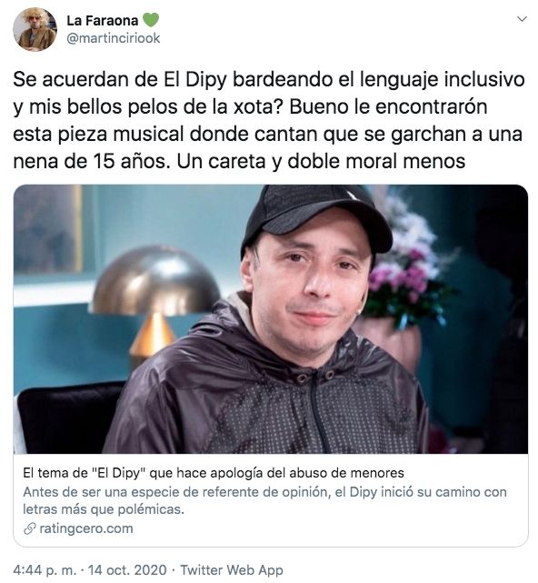 Martín Cirio cuestionó a El Dipy por una canción en la que hacía referencia a tener relaciones sexuales con una niña de 15 años. Dijo que si bien las épocas han cambiado, siempre fue considerado pedofilia.