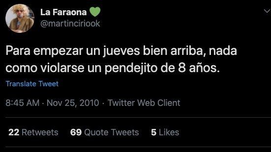 En una story en la que se lo ve claramente afectado, La Faraona tuvo que disculparse, argumentó que en algún momento ese estilo de humor le pareció gracioso, aunque hoy entiende que quienes han sufrido abusos de pequeños no merecen ese tipo de chistes. Se defendió asegurando que no es un delincuente y que nadie que sea capaz de hacer realmente estas vejaciones lo daría a conocer en Twitter.