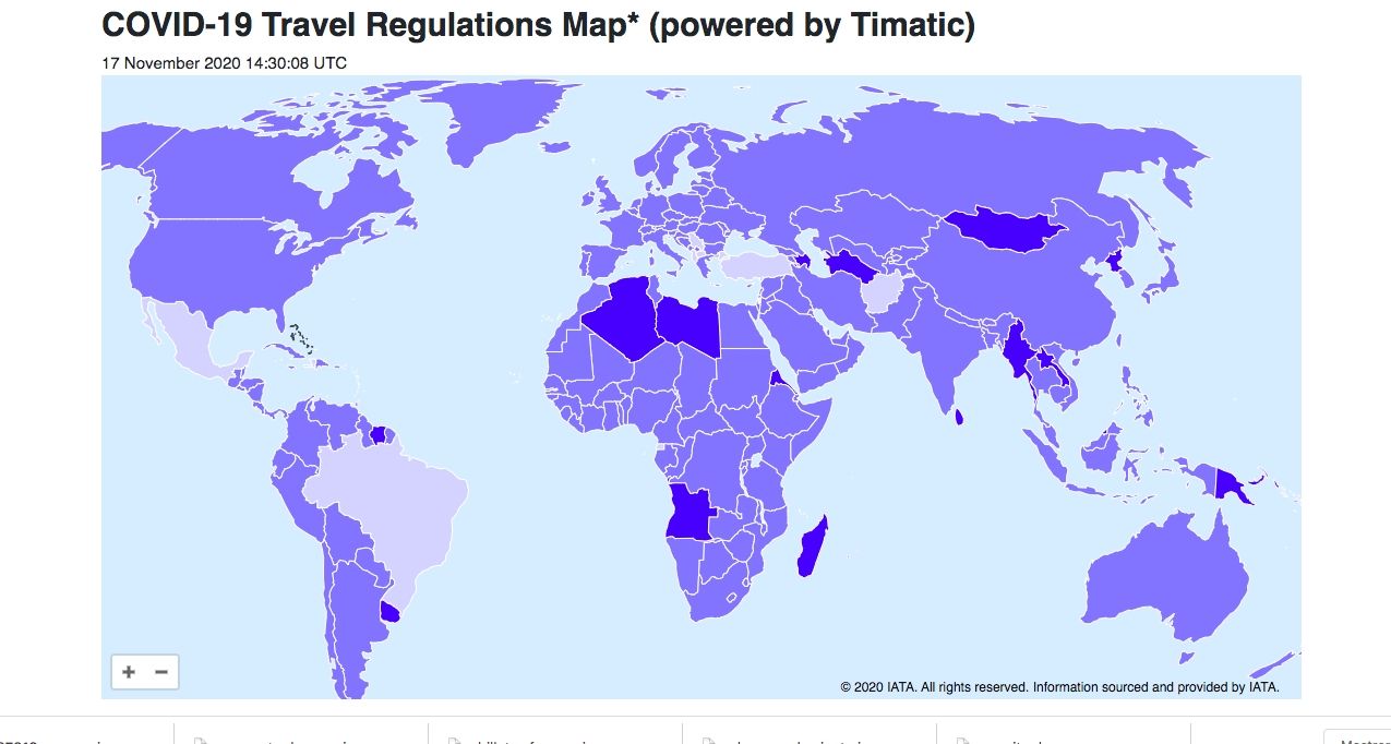 Para los viajeros que quieran estar al tanto de las distintas restricciones que existen en cada país, hay un mapa interactivo dónde está la información actualizada en tiempo real. Esto es muy importante ya que las medidas se modifican de forma permanente. Incluso también figuran los requisitos de visado y demás papeles aduaneros en https://www.iatatravelcentre.com/world.php.