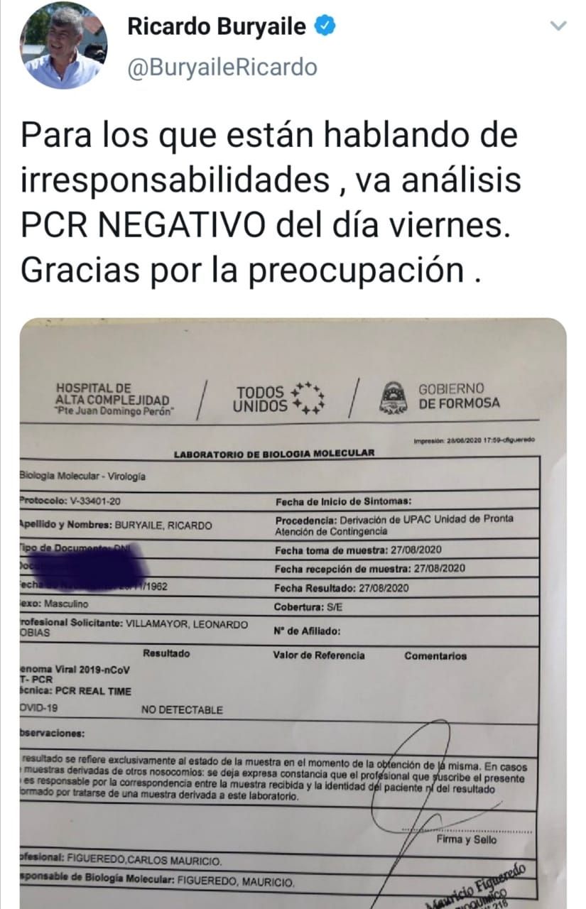 Ricardo Buryaile manifestó: "no soy un manifestante en contra de la cuarentena, yo cumplo con la cuarentena, pero si yo la cumplo, las autoridades también. Esto nos dice dos cosas, depende quien viole la cuarentena es la mirada, y segundo llamar la atención de que va a pasar en la Argentina en el próximo año".