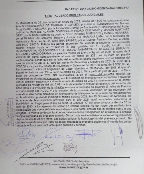 Finalmente los trabajadores que se desempeñan en la órbita del poder judicial tendrán un aumento salarial para este 2021. El incremento acordado será del 20%, en tres tramos, y el bono no remunerativo de $54.000 que se repartirá en cuotas durante el año.