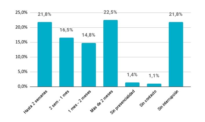 Por otra parte, en el relevamiento se pudo ver la magnitud de las interrupciones en la presencialidad como consecuencia de la aplicación de medidas sanitarias. Tres cuartas partes de las escuelas vieron interrumpida la presencialidad este año por restricciones sanitarias: en el extremo superior, un 22,5% de las escuelas tuvo interrupciones por un tiempo mayor a los dos meses, según aparece en el informe.