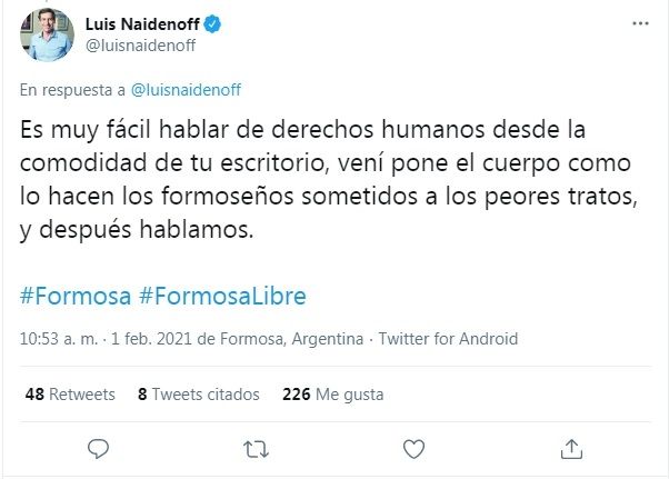 Frente a esta situación, Naidenoff expresó: "Nada nuevo bajo el sol, en cuanto a lo que tienen que ver con las violaciones a los Derechos Humanos en mi provincia. La diferencia, en estos últimos tiempos es que no se salvó nadie. La vulneración de derechos siempre ha estado a la orden del día, pero quizás de manera selectiva".