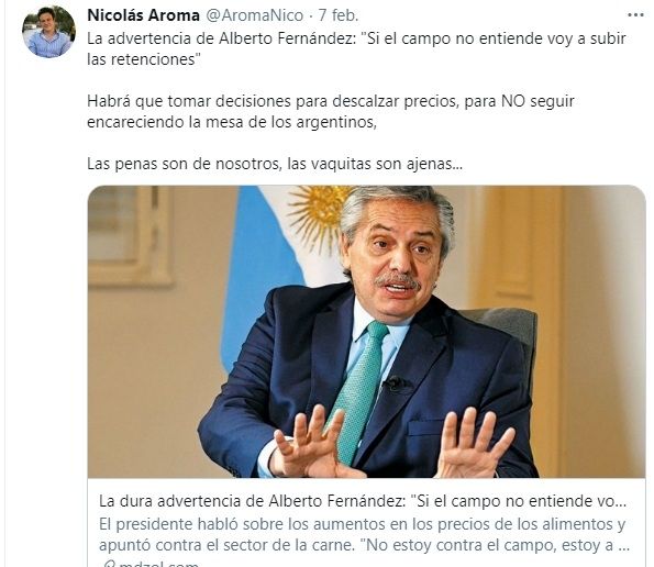 "El gran problema es donde se produce esa especie de inflación importada", el ejemplo citado es que hay un argentino que vende trigo y otro que hace harina, ese trigo se vende al productor de harinas al mismo precio que ofrece en el mercado internacional. "Si el precio internacional no sube el trigo, porque voy a venderte trigo a vos, para que produzcas harina, si lo puedo vender caro afuera", argumenta Aroma.