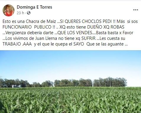 "Esto es una chacra de maíz, si querés choclos, pedí" así arrancaba el posteo de la ex legisladora Dominga Torres, que acompañaba sus palabras con mucha indignación por el suceso.