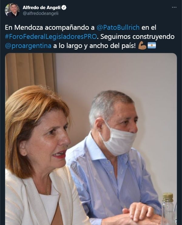 Mendoza estuvo con mucho movimiento político estos días. La exministra de Seguridad de la Nación, Patricia Bullrich, visitó la provincia para presentar su libro "Guerra sin cuartel". Más allá de esa actividad puntual, se desarrolló el Foro Federal de Legisladores Pro, donde estuvieron presentes figuras de la política local y nacional, entre ellos el actual senador, Alfredo de Angeli.