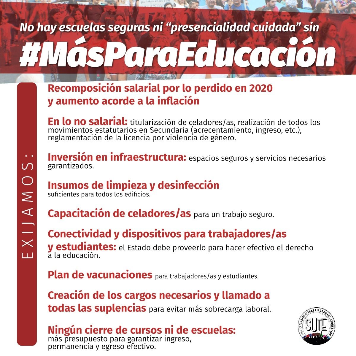 Entre las razones que motorizaron esta medida de fuerza está el descontento por la vuelta a la presencialidad con escuelas que no están en condiciones, los salarios luego del decreto del gobierno y la necesidad de mejores condiciones laborales.