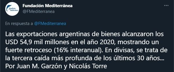 "La caída de las exportaciones argentinas alcanzó el 16%, eso es más del doble que la caída a nivel global, que estuvo entre el seis y siete por ciento", esa afirmación se detalla en el informe presentado por la Fundación Mediterránea, donde se detalla lo que sucedió con las exportaciones que se realizaron a nivel nacional.