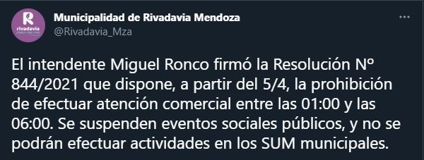 El intendente de Rivadavia, Miguel Ángel Ronco, firmó una resolución donde dispuso la prohibición de la atención comercial entre la 1 y las 6 y la suspensión total de eventos públicos desde el próximo lunes 5 de abril.