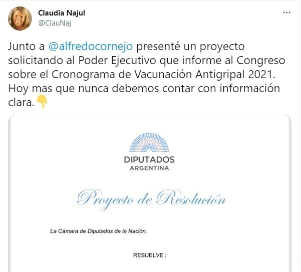 En el medio de la polémica de la campaña de vacunación antigripal está la situación de la vacunación contra la covid. Al respecto, Najul expresó: "La situación por la que estamos atravesando, todos sabemos que es muy difícil, la vacuna es una y la gran salida de la pandemia, pero hay que construir confianza, y eso se construye justamente con transparencia de la información. La población debe estar tranquila. Cualquier vacuna siempre será mejor que no tener ninguna".