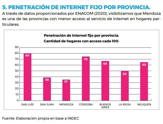 En cuanto a la penetración de internet fijo en los hogares, el índice en Mendoza se mantiene como uno de los menores a nivel país. Con un 37 %, se ubica por debajo de jurisdicciones como San Luis (80 %), Córdoba (75 %), Buenos Aires (68 %), Neuquén (65 %) o La Rioja (50 %), que a diferencia de nuestra provincia, presentaron mejores guarismos que hace un año.