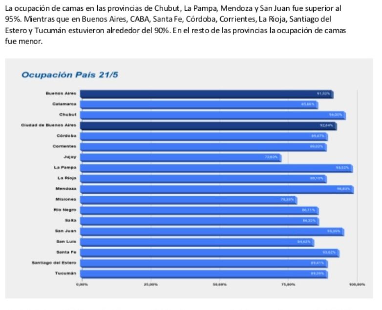 Los indicadores que exhibe el reporte nacional diariamente se completan con el nivel de testeos y el de ocupación de camas de Terapia intensiva. En esto último hay fuertes diferencias entre lo que se ve en el promedio nacional y la consulta más territorial sobre la situación de las provincias hacia adentro. En Mendoza, San Juan, Chubut y La Pampa la ocupación supera el 95%.
