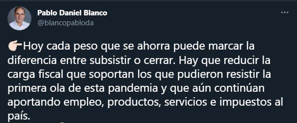 "Hoy cada peso que se ahorra puede marcar la diferencia entre subsistir o cerrar" describió el senador Blanco. Por tal motivo, reiteró que hay que sentarse y discutir el sistema impositivo con todas las posiciones: "La carga impositiva es alta, hay tanta cantidad de impuestos que la es impagable".