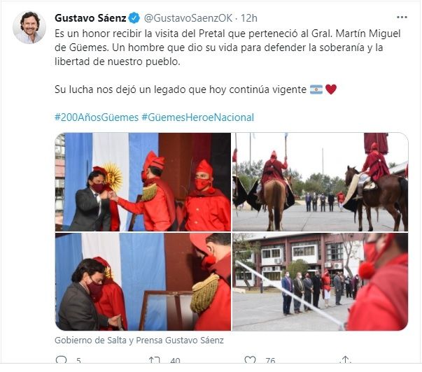 Este mes se cumplen 200 años de su fallecimiento, por tal motivo Gustavo Sáenz, gobernador de Salta, manifestó: "La figura de este prócer en los billetes institucionalizaría en un espacio público de homenaje en la difusión e identificación de Güemes en toda la ciudadanía".