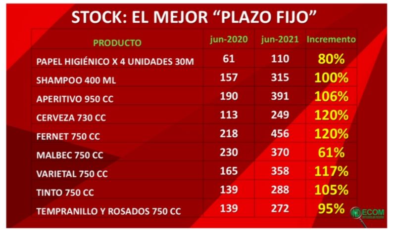 En diálogo con MDZ Radio Miguel Calvete, presidente del Indecom contó algunos detalles del informe. En términos de rentabilidad, es mucho más conveniente invertir en la adquisición de productos de consumo masivo que apostar a los intereses que ofrecen las entidades bancarias. "Cuando analizamos las tasas de plazo fijo de los depósitos bancarios varían entre un 35 y un 42% de interés, analizamos 9 productos que tienen una variación de precios entre un 80 y un 120%". Por este motivo, destacan desde Indecom que el acopio de ciertas bebidas alcohólicas y de higiene personal otorgan tasas anuales de ganancias que llegan a triplicar las otorgadas por los plazos fijos.
