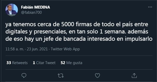 La iniciativa se presentaría el 15 de julio en la Cámara de Diputados, con la cantidad de firmas necesarias que son 40 mil. "Con esas firmas obtendremos número de expediente y sería tratado en agosto. Y si conseguimos dos o tres legisladores que firmen el proyecto para mandarlo al recinto, las firmas apoyarían esa decisión", finalizó Fabián Medina.