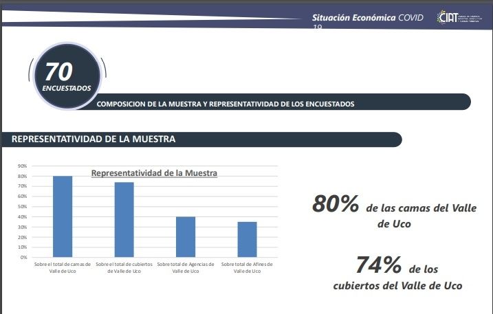 Se trata de un informe en el que se relevaron 70 empresas y prestadores turísticos que son representativos. El 80% de las camas que se ofrecen en el Valle de Uco y el 75 % de los cubiertos. Según relataron desde la Cámara de Turismo, "el sector turístico en general está representado en esa muestra".