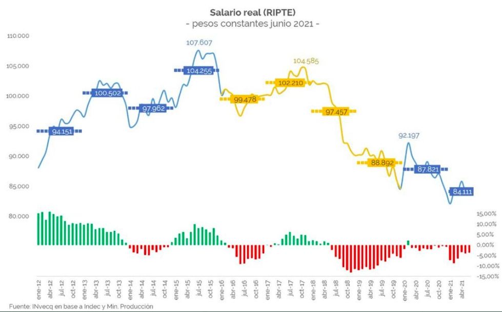 El salario real de los trabajadores en Argentina viene perdiendo de forma ininterrumpida en la última década. Según el análisis de la consultora Invecq en base a los datos oficiales de la Remuneración Imponible Promedio de los Trabajadores Estables (Ripte) estamos actualmente en el peor momento. En el 2012, el salario promedio era de $94.151, tres años más tarde alcanzó los $107.607. A partir de ese punto alto la caída fue constante hasta los $84.111 de abril de 2021.