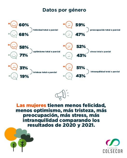 Entre las desigualdades que "aunque esperables resultan impactantes" -destacó Riorda- es que "las mujeres tienen menos felicidad, menos optimismo, más tristeza, más preocupación, más stress, más intranquilidad comparando los resultados de 2020 y 2021". Esto aunque probablemente se sepa porque "hay datos objetivos de violencia de género, de las asimetrías y las desigualdades. Hay datos objetivos de lo que significa cierta inercia de la carga del machismo que posa en la mujer el cuidado dentro del hogar entre otras cosas.