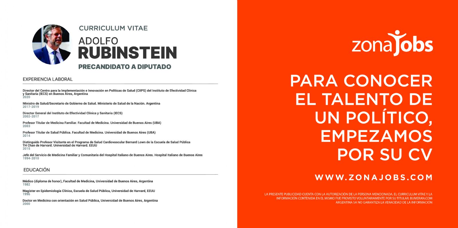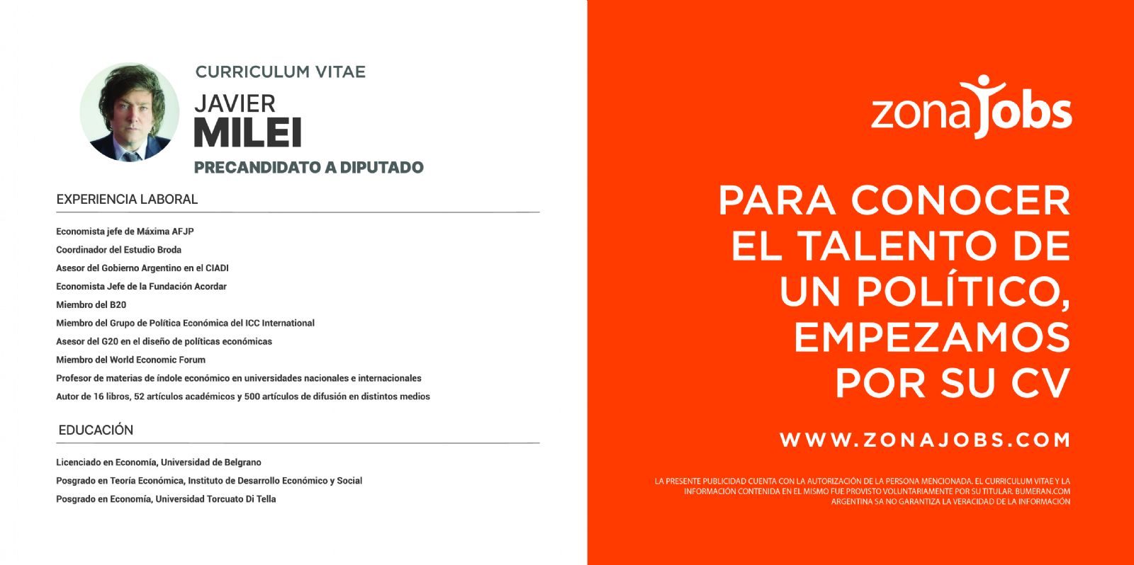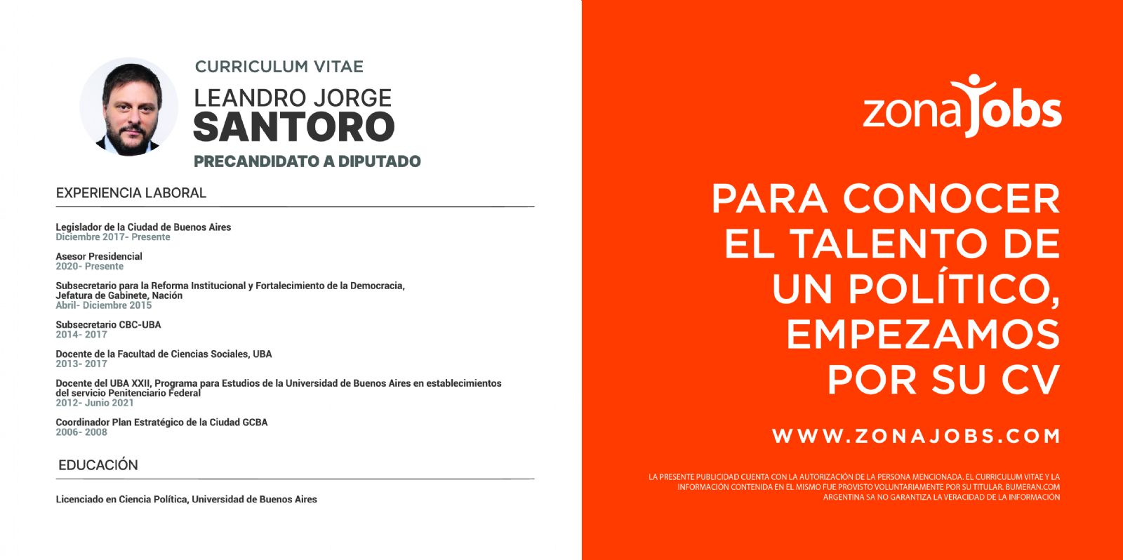 De cara a las elecciones primarias que se llevarán a cabo en septiembre, en Argentina, Zonajobs y Together w/ publicaron los currículum de quienes aspiren a algún cargo en el marco de una campaña publicitaria. Together w/ es una agencia independiente de creatividad, tecnología, servicios de producción y medios. Su aliado fue Zonajobs que es el portal de empleos líder del mercado.