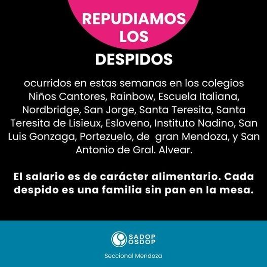 El Sindicato Argentino de Docentes Privados (Sadop) lanzó hace unos días un posteo en sus redes sociales rechazando los despidos de empleados de diferentes colegios mendocinos, tanto del Gran Mendoza como del sur provincial.