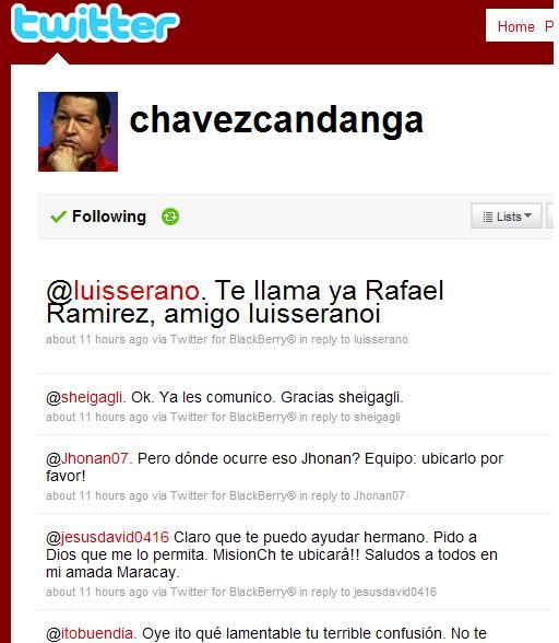 Aquí vale un paréntesis. Nadie sabe quién está detrás de sus nicks oficiales como usuarios de Twitter. Puede que estén los mismísimos mandatarios todo el día con su BlackBerry (como parece que en la Argentina lo hace el ministro Aníbal Fernández, de quien hablaremos luego). Pero en el caso de Chávez, el diario Últimas Noticias rompió ese mito: afirmó este fin de semana que serían unas “200 personas las que trabajan detrás de @chavezcandanga”.