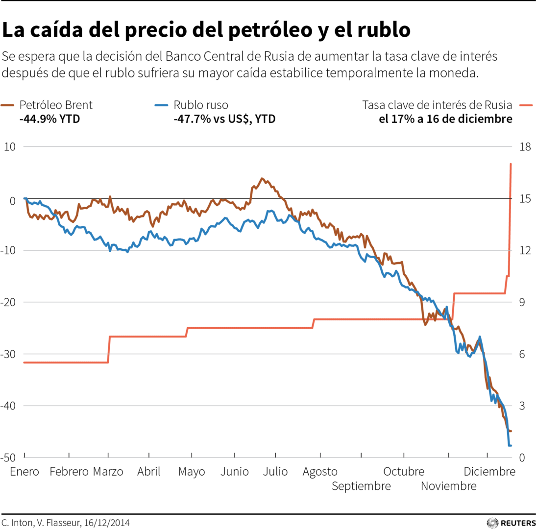 Ha sido cuestión de meses: la caída del precio del crudo ha provocado un agujero fiscal descomunal en los presupuestos rusos, enormemente dependientes de la extracción de recursos naturales. Las sanciones llevaban meses provocando una fuga de capitales considerable del país; con una crisis fiscal en ciernes y la economía cada vez más debilitada, la salida de dinero se ha acelerado aún más. El rublo se ha depreciado prácticamente un 50% desde agosto, cuando las sanciones empezaron a endurecerse; la inflación rusa se ha disparado, y la economía rusa ha entrado enrecesión. Tras varias semanas intentando detener en vano la imparable caída del rublo a base de gastar 80.000 millones de dólares en reservas, esta madrugada el banco central ruso subía los tipos de interés seis puntos y medio de una tacada, del11,5% al 17%. La aventura de Putin se ha convertido en una descomunal crisis cambiaria, con Rusia ahora mismo ejerciendo el papel habitualmente reservado a Argentina en estos acontecimientos.
