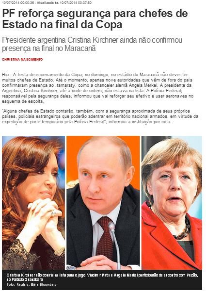 Por su parte, el diario local O Dia, dice en Rio que se ha reforzado la seguridad para el partido final "por la presencia de varios jefes de Estado", entre ellos, Angela Merkel, Cristina Fernández de Kirchner y hasta Vladimir Putin.