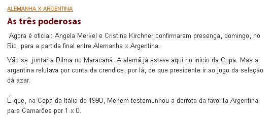 "Las tres poderosas se reunirán en el Maracaná", informa, en su portada digital, el diario brasileño O Globo. Sostiene que las presidentas Dilma Rousseff, Angela Merkel y Cristina Fernández de Kirchner asistirán a la final del Campeonato Mundial de Fútbol de Brasil, el próximo domingo, a las 16, en el Maracaná. Allí los seleccionados de Argentina y Alemania jugarán por la copa del mundo, que será entregada, según confirmaron -y a pesar de los insultos recibidos días atrás- por la mandataria anfitriona. Dice el bloguero Ancelmo Gois en O Globo que "la alemana estuvo aquí desde el comienzo del campeonato, pero la argentina se mostró reacia por la superstición. Es que el Italia 90 Menem fue testigo de la derrota de la favorita ante Camerún por 1 a 0. Quedó la idea de que ir a ver a la Selección trae mala suerte".