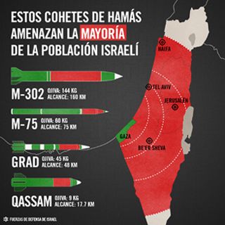 Israel calcula que en poder de los palestinos hay unos 6.000 cohetes que "amenazan a la mayoría de la población israelí". Así lo informó el diario local Aurora, que mostró un mapa con el alcance que tendrían los misiles de los palestinos en poder de Hamás, que el medio denomina como "la querrilla que gobierna la Franja de Gaza".