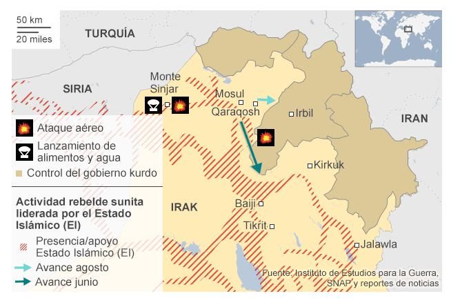 Las fuerzas armadas extranjeras ya se han implicado en este conflicto. El presidente de Estados Unidos, Barack Obama, sancionó la realización de una serie de bombardeos sobre Irak con el objetivo de derrotar a las milicias del Estado Islámico. 130 militares estadounidenses han llegado a Irak con la misión de evaluar la crisis humanitaria que afecta a los yazidíes atrapados en la montaña Sinjar. Mientras tanto, la ofensiva de los milicianos del Estado Islámico en el país continúa.